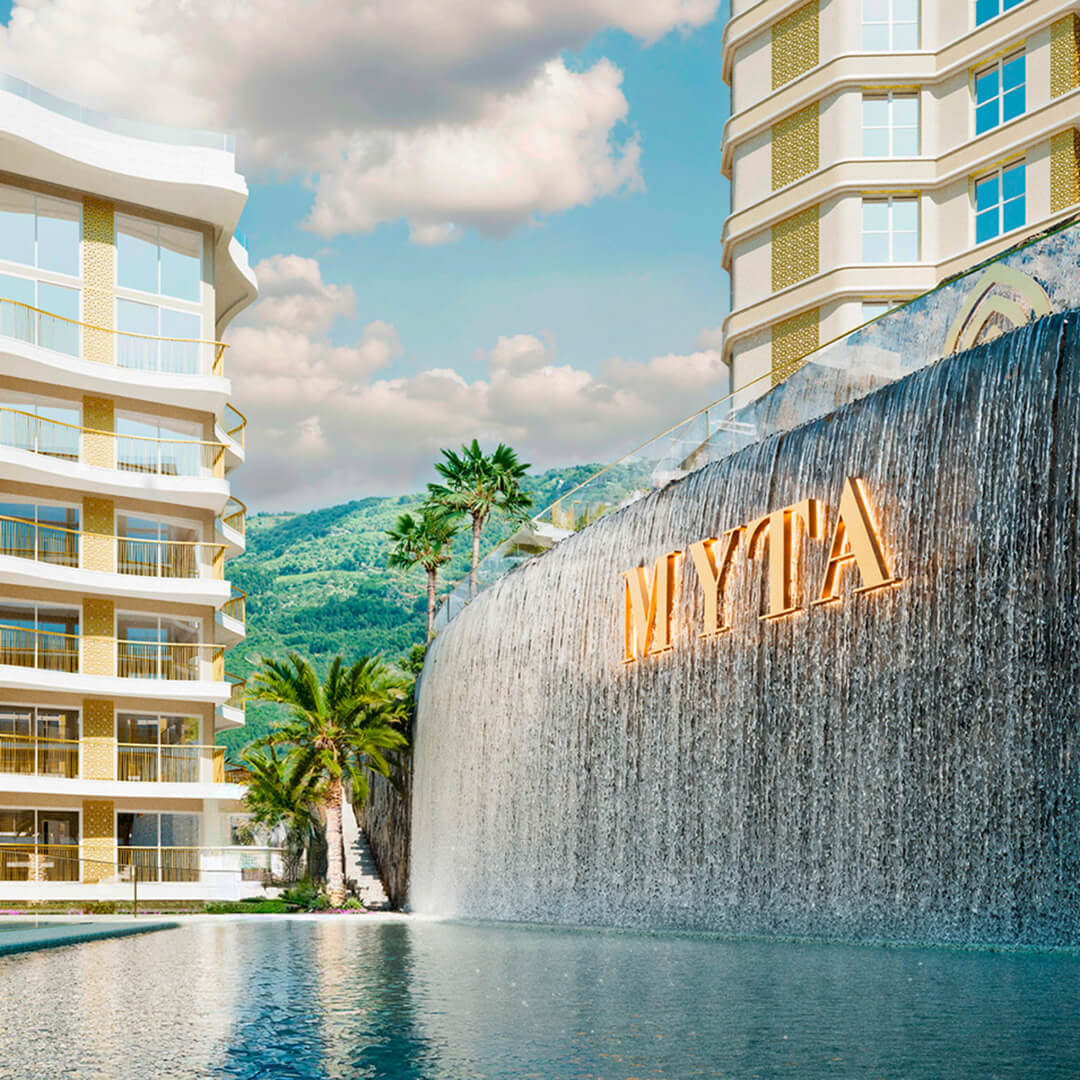 Территория комплекса «Майта» тщательно спланирована и обустроена с особым вниманием к деталям. Внутренний двор оформлен в стиле авторского ландшафтного дизайна с ухоженными зелеными насаждениями и уютными зонами для отдыха. Центром притяжения является искусственный водопад, создающий атмосферу уединенности и гармонии с природой.